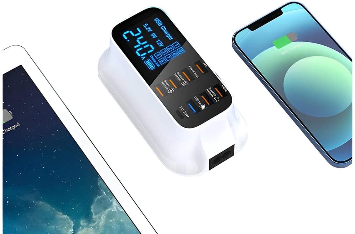 The Fast Phone Charger 8-Port USB QC 3.0 with Type-C Desktop Network LCD 40W is the perfect solution for quick and efficient charging. Crafted with high-quality materials, it features protection against short circuits, overvoltage, and overcharging, automatically adjusting the current to suit each device. Equipped with 6 USB Type-A ports (5V/8A max), 1 USB Type-A QC 3.0 port (5.2V 3A; 9V 2A; 12V 1.5A), and 1 USB Type-C port (5V/2A), it offers versatile connectivity. The charger has a total output of 40W, a long 150 cm power cord, and compact dimensions of 14 x 7.5 x 5 cm, making it ideal for desktop use. Finished in a sleek white color, the set includes a universal charger, a network cable, and original packaging—perfect for home, office, or travel use.